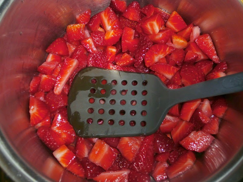 2.- Ve aplastando un poco las fresas con una espumadera o algo parecido. Cuecelas durante 10 minutos