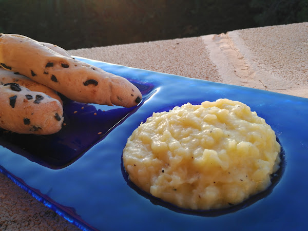 - Prensar los ajos (si no tenéis prensador, con un tenedor sobre la tabla de cortar) y mezclar con el aceite y un poco de agua de la cocción, hasta formar una salsa cremosa.
