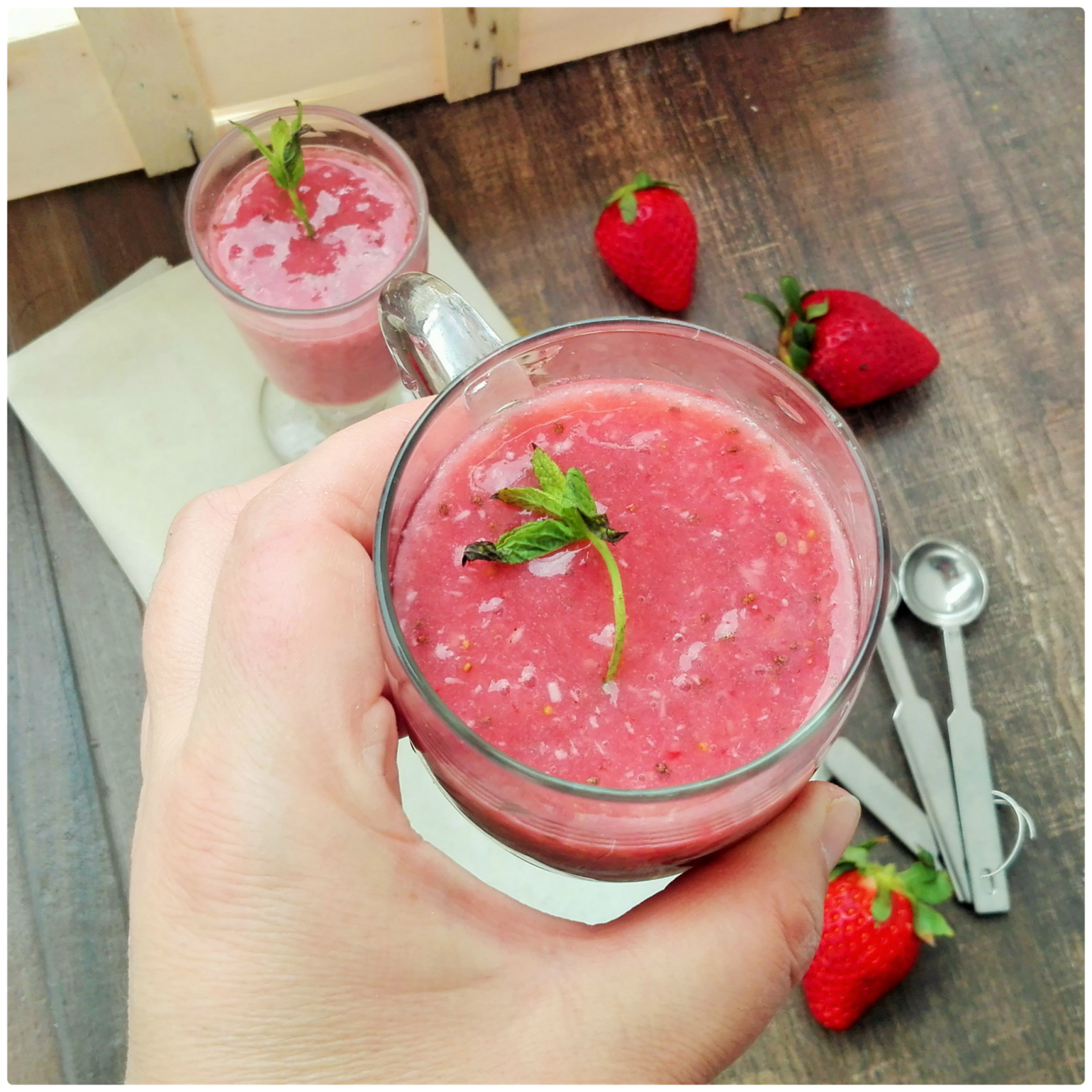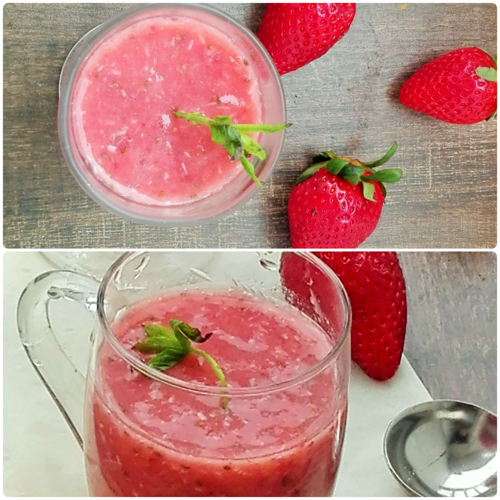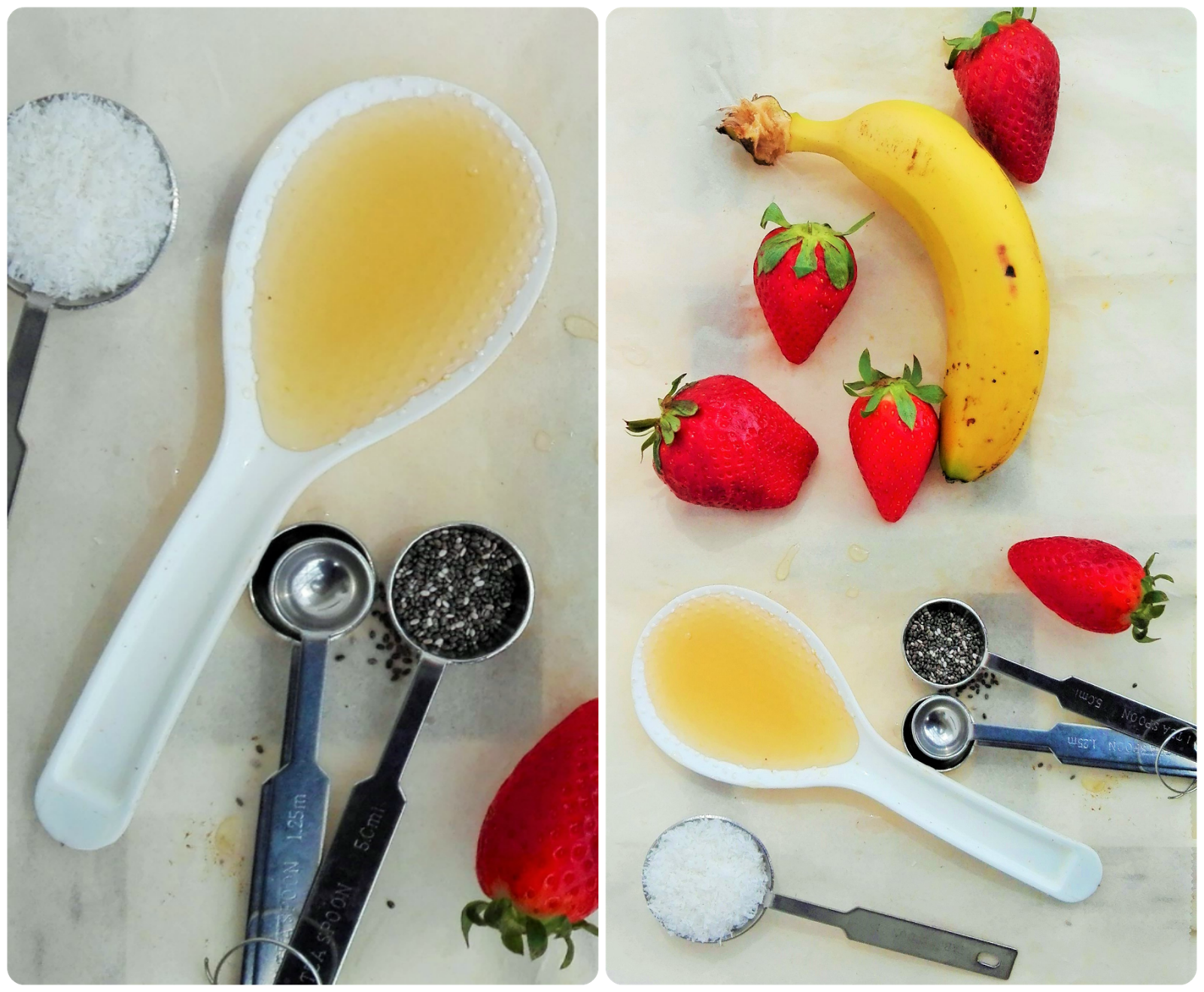 -En la batidora eléctrica echamos las fresas, plátano, chia con su agua, miel , coco y lo batimos todo.