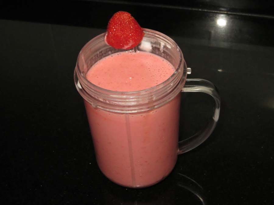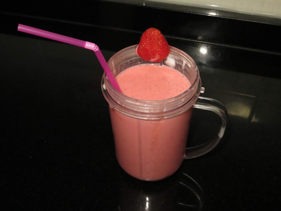 Limpiamos bien las fresas y las congelamos durante un par de horas. Sacamos y las echamos en el vaso de la batidora. A continuación, añadimos el resto de los ingredientes y batimos hasta que tenga la textura deseada. Echamos en los vasos, decoramos y ya está listo para beber.