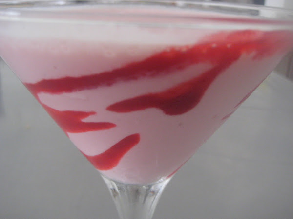 Preparación: Triturar las fresas a través de un chino para eliminar las pepitas. Un vez obtenido el puré de fresas poner en una jarra y agregar los yogures, la nata (crema de leche), la leche y el azúcar. Batir bien y colocar en copas o dejarlo en la jarra en la nevera hasta el momento de servir para que esté bien fresquito. Yo he decorado los laterales de la copa con un poco de puré de fresa azucarado y las he dejado en el congelador hasta el momento de servir.