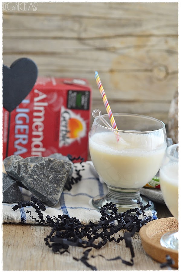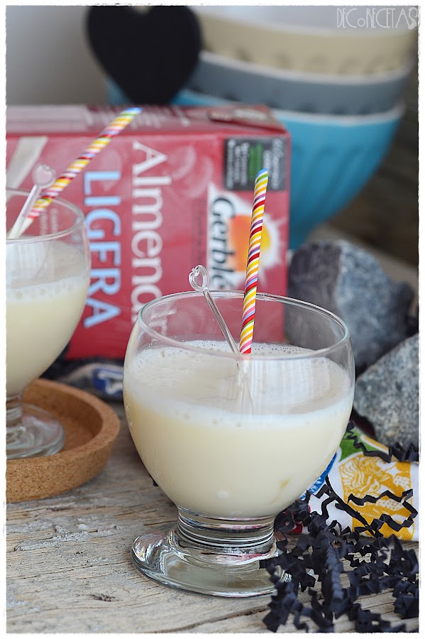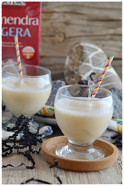Agradecer a la cajita "Disfrutabox" de este mes esta receta, porque la leche de almendras era uno de sus productos integrantes. También tuvimos muchas más cositas como: mayonesa, zumos, cerveza, aperitivos, pechuga de pollo, galletas y hasta un champú estupendo