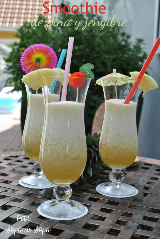 Pelar la piña y cortarla en dados. Poner en un vaso americano o batidora la piña, con el zumo de manzana, un chorrito de zumo de limón y jengibre fresco cantidad al gusto ( no mucho, ya que tiene un sabor muy intenso). Triturar y listo para verter en los vasos. Servir muy frío.