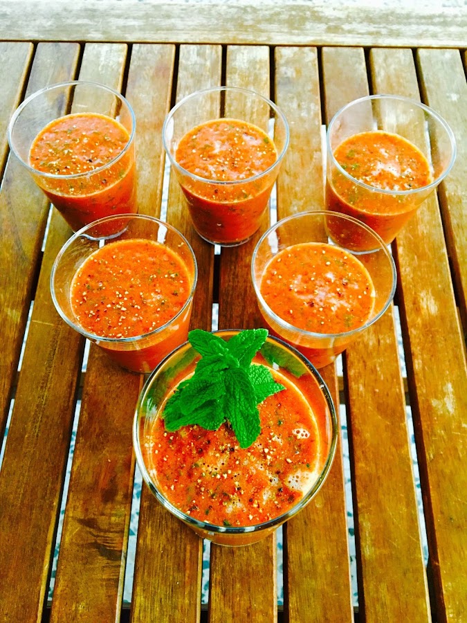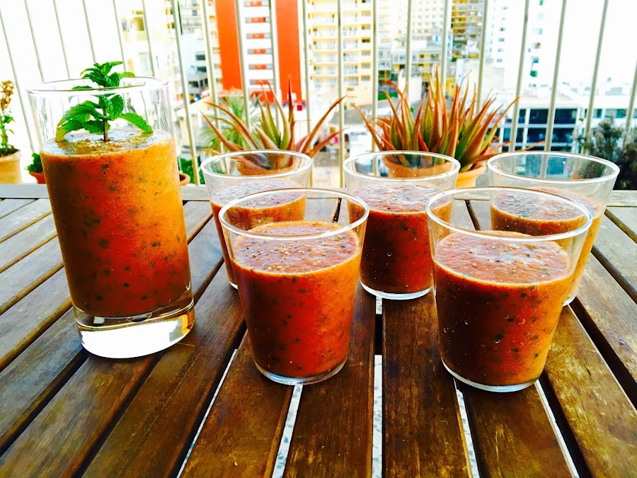 Tal y como sale de la batidora será como vamos a servir este refrescante y sanísimo smoothie. Cuando lo tengamos en el vaso podemos añadirle un poco de pimienta negra molida y unas hojas de menta. Y a disfrutarlo!!!!!