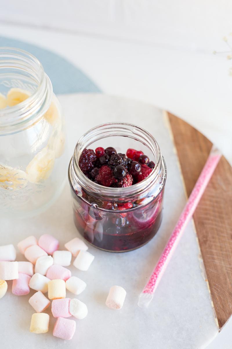 Para el batido de frutos rojos poner en un vaso de batidora el yogur griego junto con los frutos rojos y el resto del plátano. Nuestros frutos rojos eran congelados, antes de usarlos los hemos descongelado. Esta última fruta dará más cremosidad y cuerpo a nuestro batido de frutos rojos. Batir bien y poner en el vaso donde vayamos a presentar. Para el batido de nube poner en la batidora el helado de nube, junto con la leche y batir durante unos segundos para que adquiera cremosidad. Nosotras hemos usado leche de almendra, que es la que solemos tener por casa, pero podéis usar la que queráis.