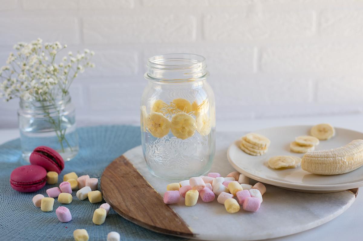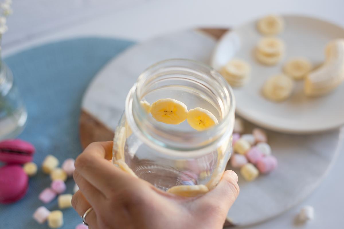 Comencemos preparando el plátano para que irá pegado en las paredes del recipiente de presentación. Nosotras hemos elegido un bote de cristal tipo de conserva. Cortar en rodajas el plátano, tan sólo laminar la mitad. Tomar cada rodajita y pegarla en el bote por dentro, se pegará sólo ya que el plátano ya de por sí es bastante pegajoso. Ahora prepraremos los batidos.