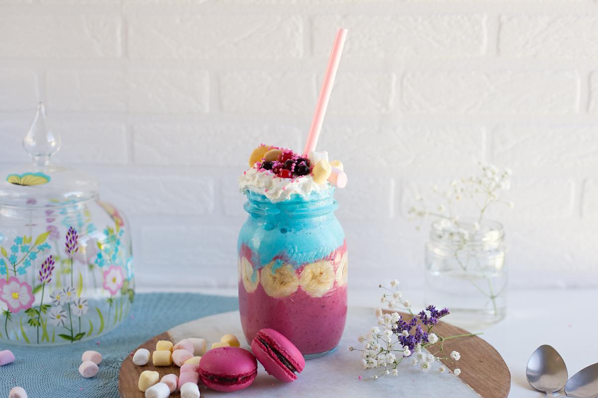 Para acabar nuestro súper smoothie helado lo hemos coronado con nata montada (crema de leche), mini nubes, frutos rojos y sprinkles rosas. Por supuesto esto último es totalmente a tu eleción!