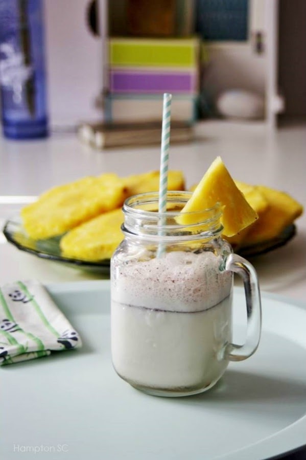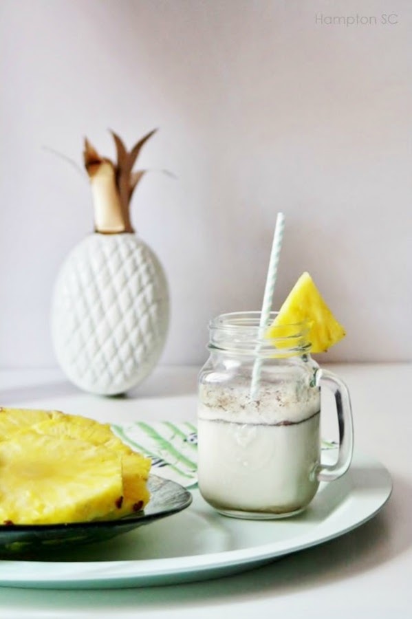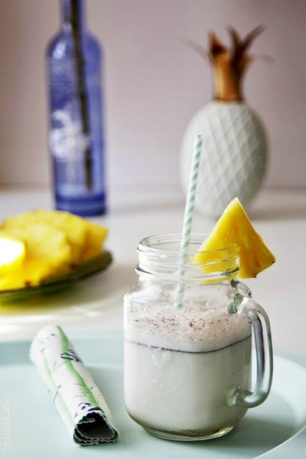 Adornamos con un trocito de piña el borde del vaso y ponemos