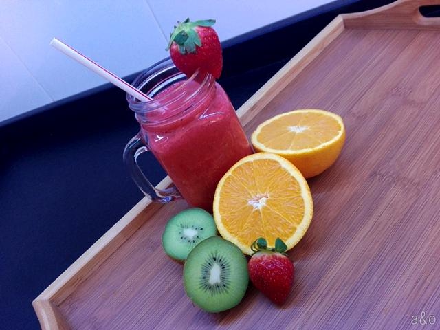 No obstante, volviendo al smoothie, os parecerá una tontería, pero este simple vaso contiene multitud de beneficios para nuestro organismo. El kiwi nos ayuda al tránsito intestinal, las fresas también poseen mucha fibra y son ricas en minerales y las naranjas nos ayudan a prevenir resfriados y a regular el colesterol. En definitiva, una bebida rica en propiedades naturales.