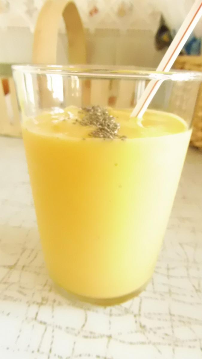 Este smoothie es rico en muchos nutrientes y propiedades: Vitamina C, vitamina B-6, vitamina A (del mango) y potasio (del plátano). Ideal para tomar en el desayuno ya que nos brinda un efecto saciante y evitará el picoteo del delito