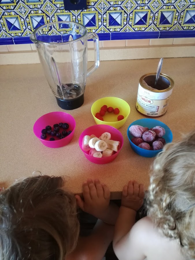 En verano los peques se levantan más tarde y con el calor les apetece algo fresquito para desayunar, fruta, yogur... lo que hacemos es un smoothie con frutas madura que previamente he congelado.