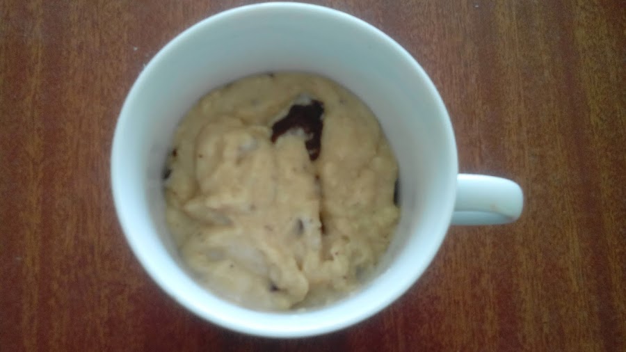 Mezclamos en la misma taza harina, galletas, polvo de hornear, azúcar, aceite, leche y chocolates.