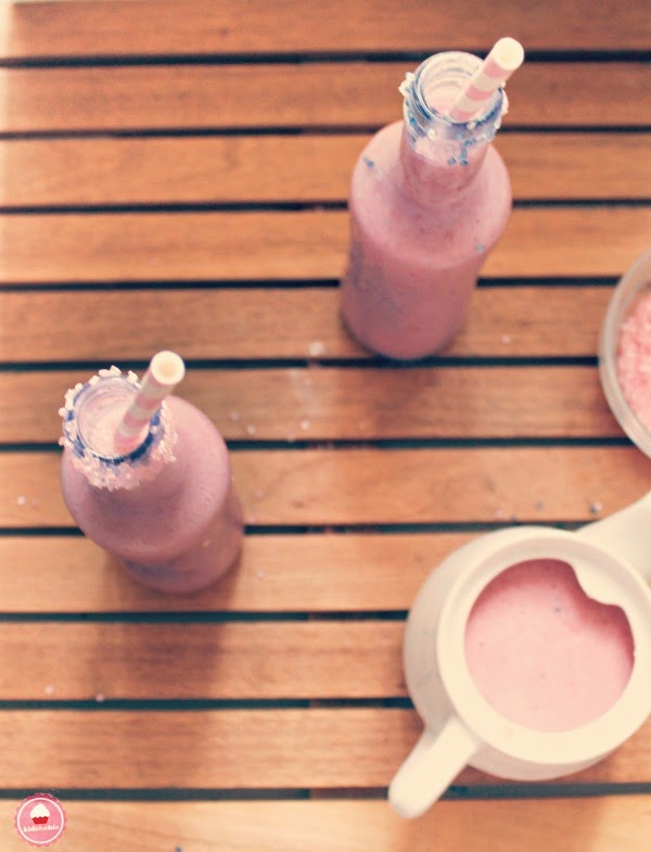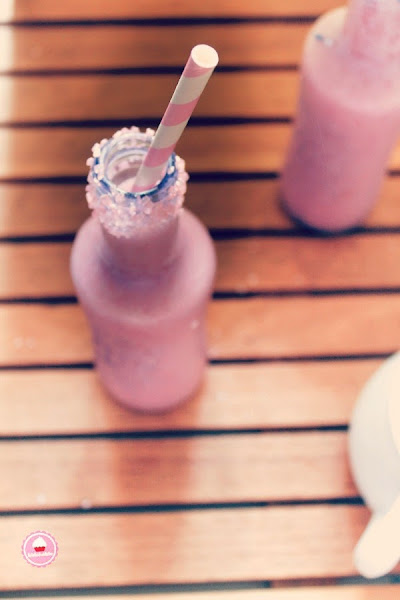 Puedes adornar la boca del vaso o botellita con unos azucarillos de colores , y así el batido será más divertido aún .