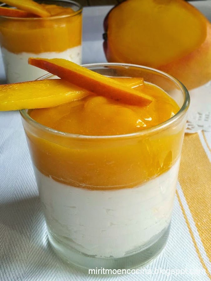 Subdividir la mouse obtenida en los vasos llenándolos un poco mas de la mitad, terminar derramando la puré de mango en la superficie.