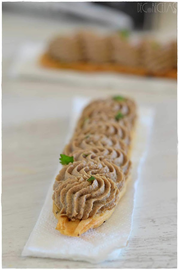 Para la presentación: Introducimos el contenido del paté dentro de una manga pastelera, y con ayuda de la boquilla abierta 6B de wilton, depositamos encima de los panecillos realizando movimientos circulares. Para terminar, depositamos hojitas de perejil por encima
