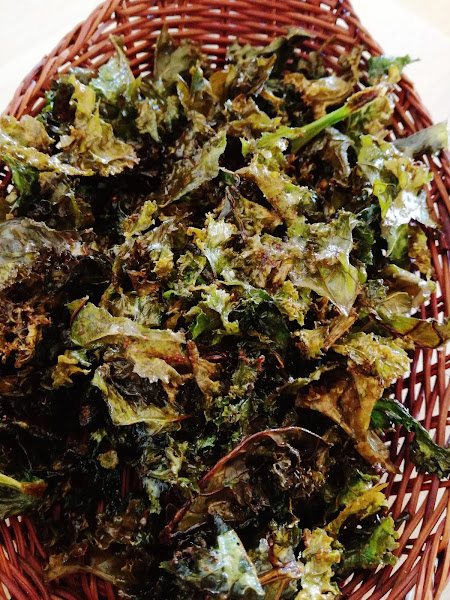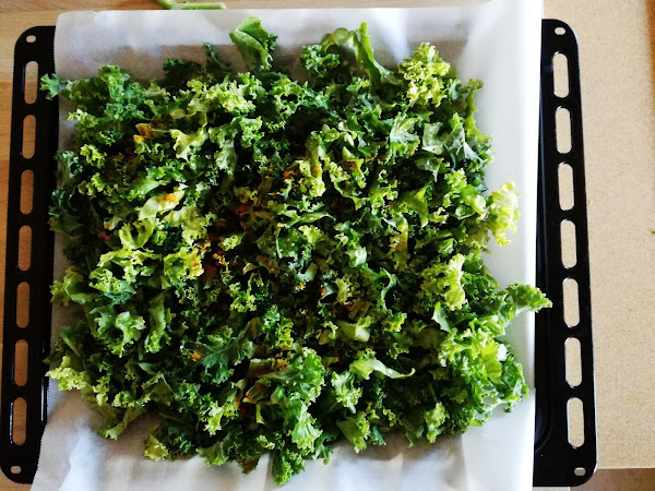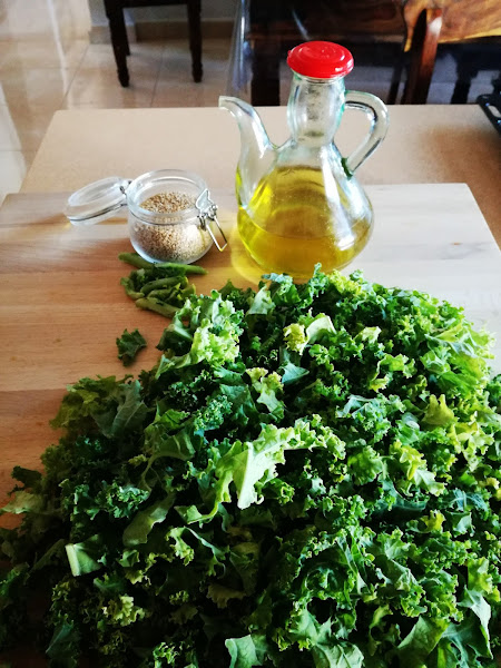 Separamos los tallos de las hojas de kale. En una bandeja con papel de hornear disponemos buena cantidad de hojas (luego se reducen) que aderezamos con un poco de sal, aceite de oliva y especias al gusto - yo utilizo cúrcuma y sésamo sin tostar-.