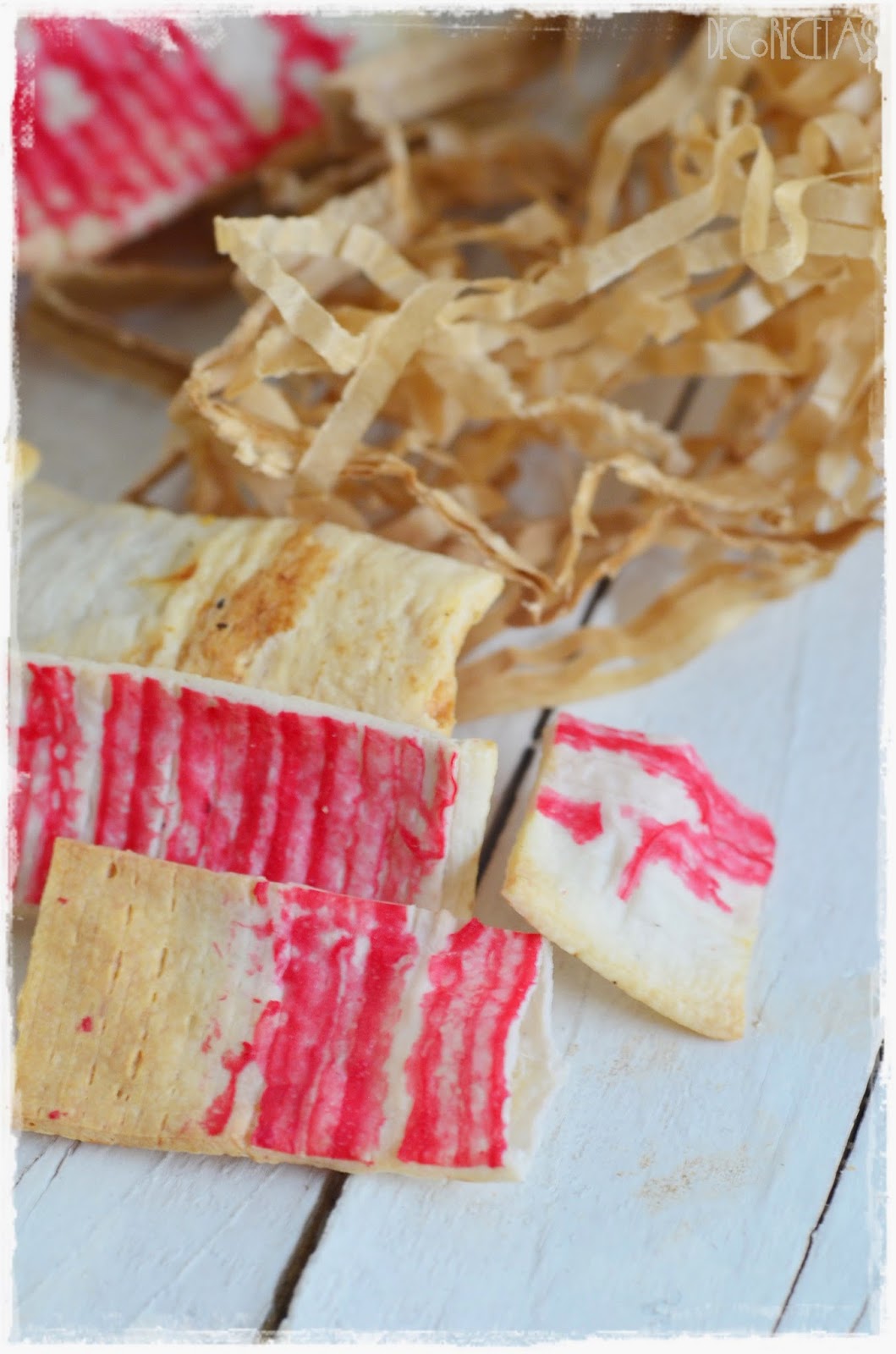 Para hacerla, descongelamos los palitos de cangrejo y los desenroscamos hasta quedarnos con la lámina completamente estirada. Yo la corté en 3 tiras y las deposité encima de una bandeja de horno. Las metemos al horno a 200º por 15 minutos a media altura.