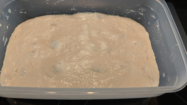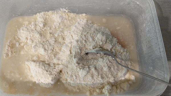 6 g de sal rosa del HimalayaMezclamos todos los ingredientes y amasamos 2 minutos a mano. Dejamos a temperatura ambiente (20 grados) unas 4 horas y metemos a la nevera durante 18 horas mínimo. Yo la tuve 36 horas