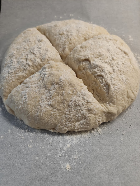 Lo colocamos encima de la bandeja. Y con la ayuda de un cuchillo marcamos en cuartos sin llegar a cortar del todo. Y lo espolvoreamos con harina