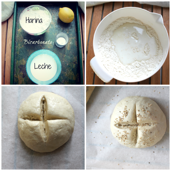 Zumo de limón .No necesita levadura , porque el bicarbonato sódico hace el efecto leudante. El suero de leche o buttermilk se consigue al añadir a la leche un ácido en este caso el zumo del limón , este reacciona con el bicarbonato sódico liberando burbujas de dióxido de carbono , que es la causante de que el pan leve .