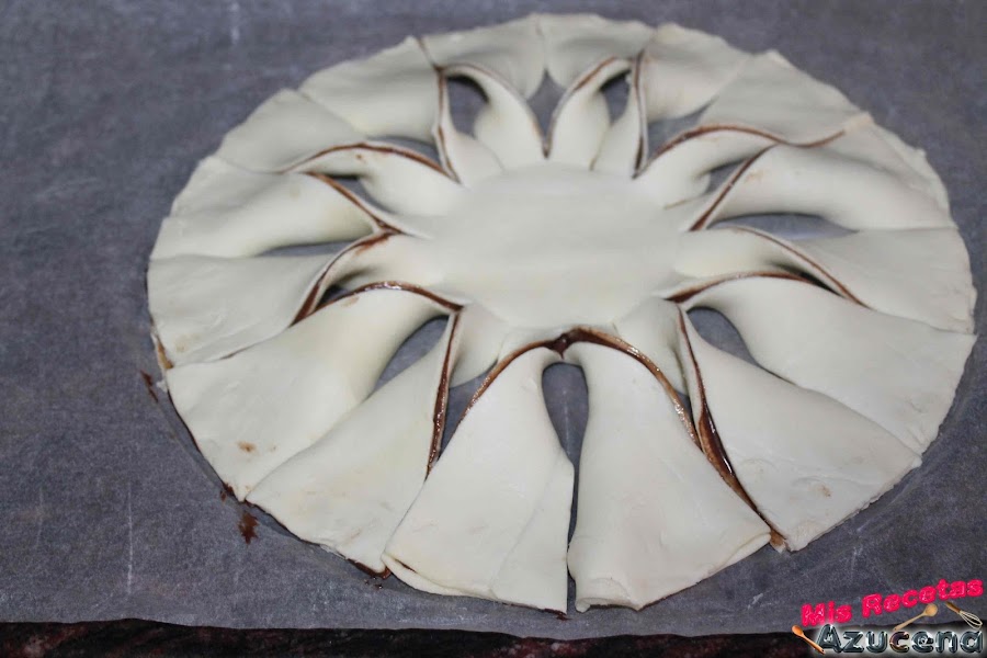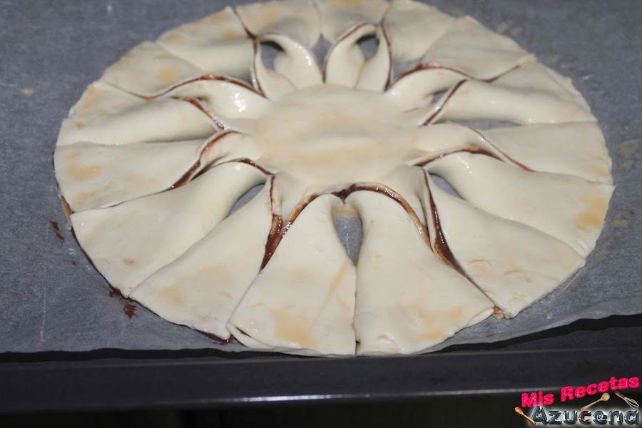 Muy buenas, para despedir la semana como veréis no me he complicado mucho, este dulce lo había visto en varios videos y blog, he de decir que ahora mismo solo me acuerdo del blog La cocina de Sole, se que ella lo hizo y le quedó genial, no se si le he puesto el mismo nombre, la verdad es que lo he visto con tres nombres diferentes, estrella, sol y flor, yo me he decidido por el de sol, jeje.