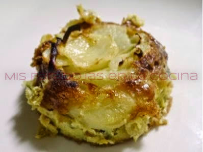 Lo único que varía un poco (muy poco) es la elaboración y presentación. Para ello tomamos un aro cortapasta (8 centímetros de diámetro y 6 centímetros de alto aproximadamente) y se unta el interior con un poquito de aceite; lo depositamos sobre una sartén con muy poco aceite. Vertemos dentro del aro un poco del huevo batido, lo suficiente para que forme una base fina para evitar fugas y, a continuación, agregamos el total del batido de huevos, patatas y cebolla. Dejar unos minutos a fuego medio y finalizar en el horno a 180º. Desmoldar con ayuda de una puntilla, decorar al gusto (tal cual, con una ramita de cebollino, espolvoreando perejil en muñequilla, puntos de mahonesa, etc.), servir y disfrutar.