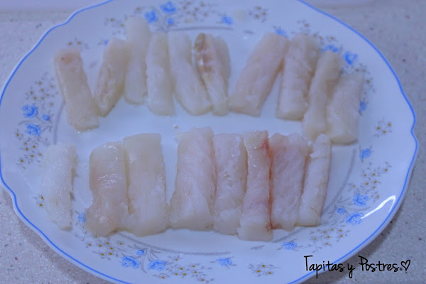 Cortamos el bacalao en palitos del mismo tamaño. Salpimentamos y rociamos con limón.