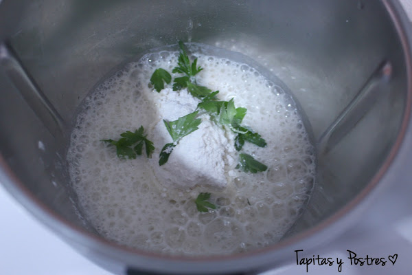 Ponemos los ingredientes de la masa en el vaso de la thermomix o de una batidora y lo trituramos 15 segundos a velocidad 5, hasta tener una masa espesa y homogénea. Dejamos en la nevera media hora.