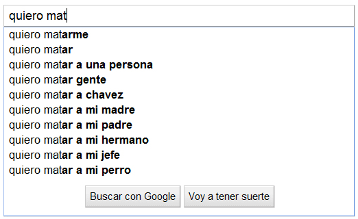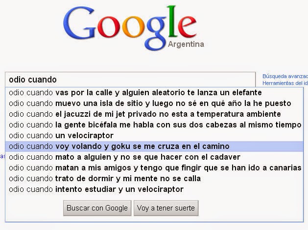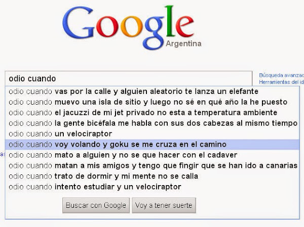 En cambio, a continuación tenemos el caso contrario. Estás enfadado con el mundo, has tenido un mal día y decides contarle a Google lo mucho que odias cuando... pero resulta que hay muchas personas que odian cosas. Por ejemplo, matar a alguien y no saber qué hacer con el cadáver... es que es una situación de lo más incómoda verdad? Y qué me decís de lo molesto que es cuando el jacuzzi de tu jet privado no está a temperatura ambiente!? La de Goku, sin comentarios... No tienen desperdicio!