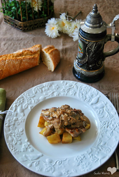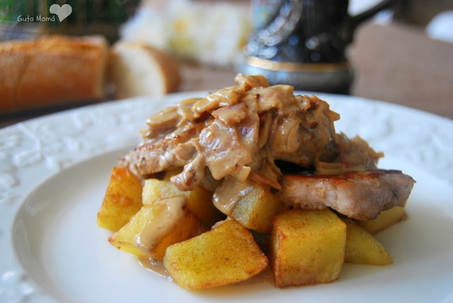 Montamos el plato para servir. Yo os propongo poner las patatas como base, una segunda capa de solomillitos y por último regar todo con la salsa. Aunque también podéis servirlo todo por separado para que cada uno se componga el plato a su gusto.