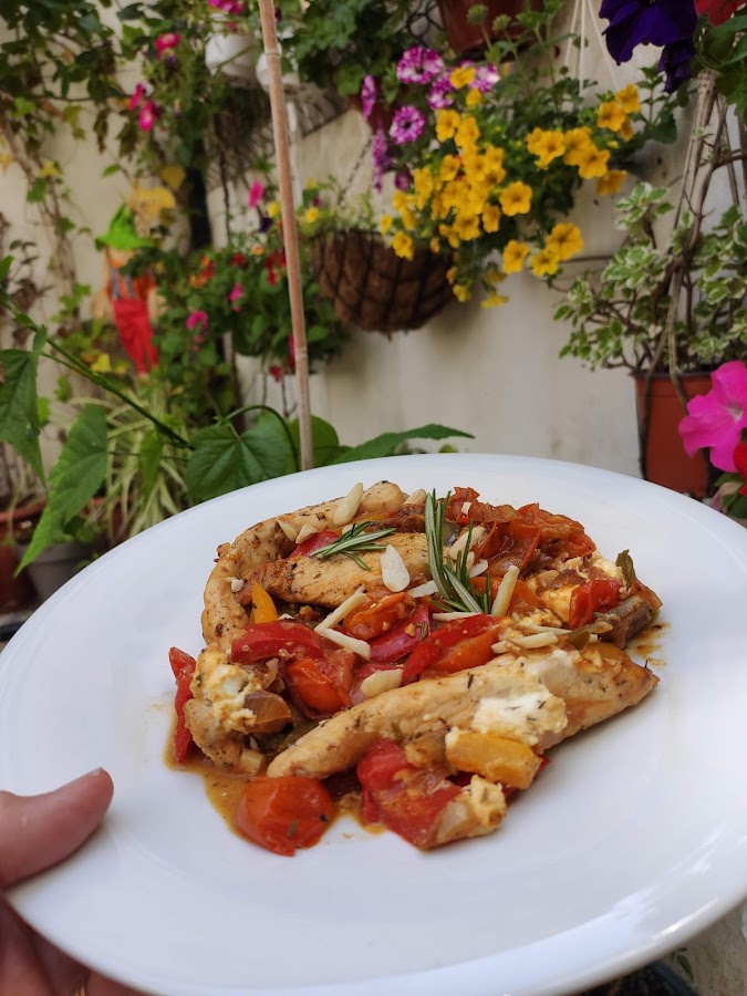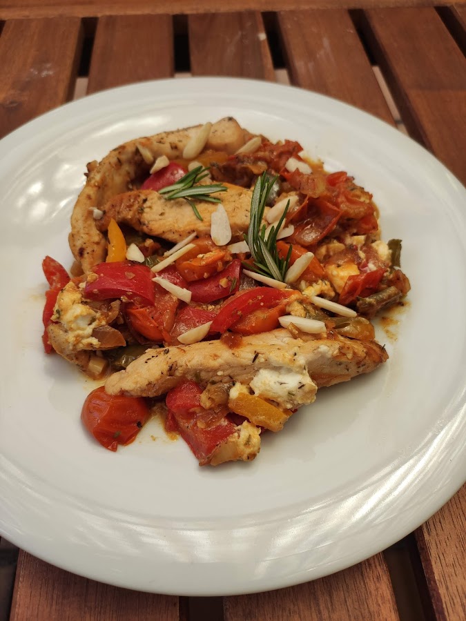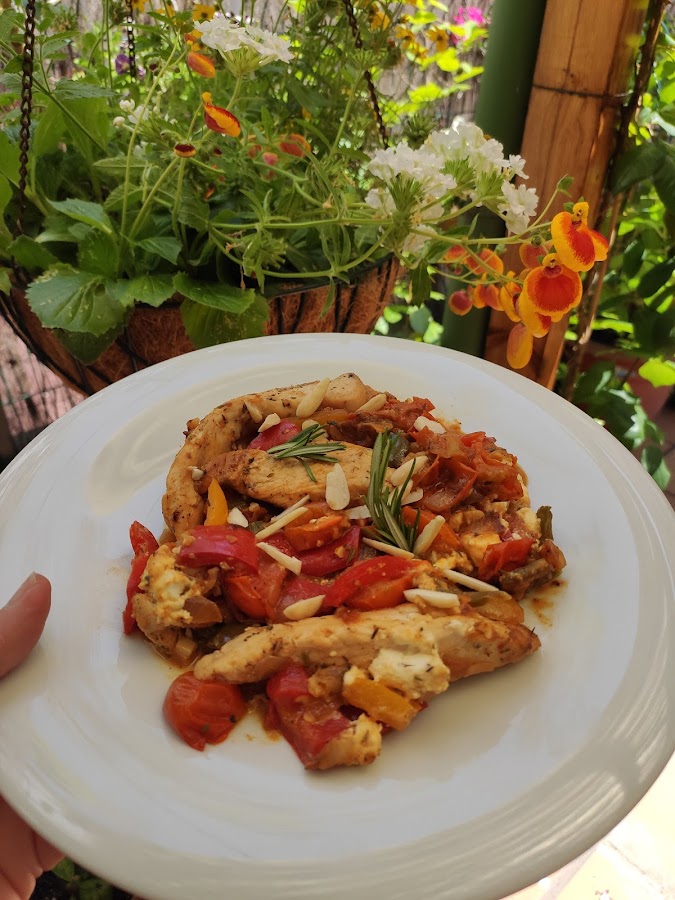Cuando el pollo esté cocinado añadimos el queso y las almendras filetedadas.. Decoramos con más romero a la hora de servir.
