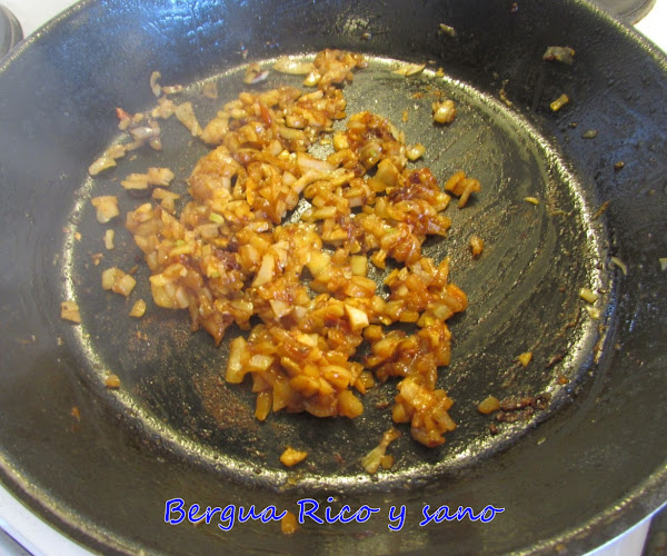 2. Calentamos otra cucharada de aceite y pochamos a fuego medio la cebolla y el ajo picaditos.