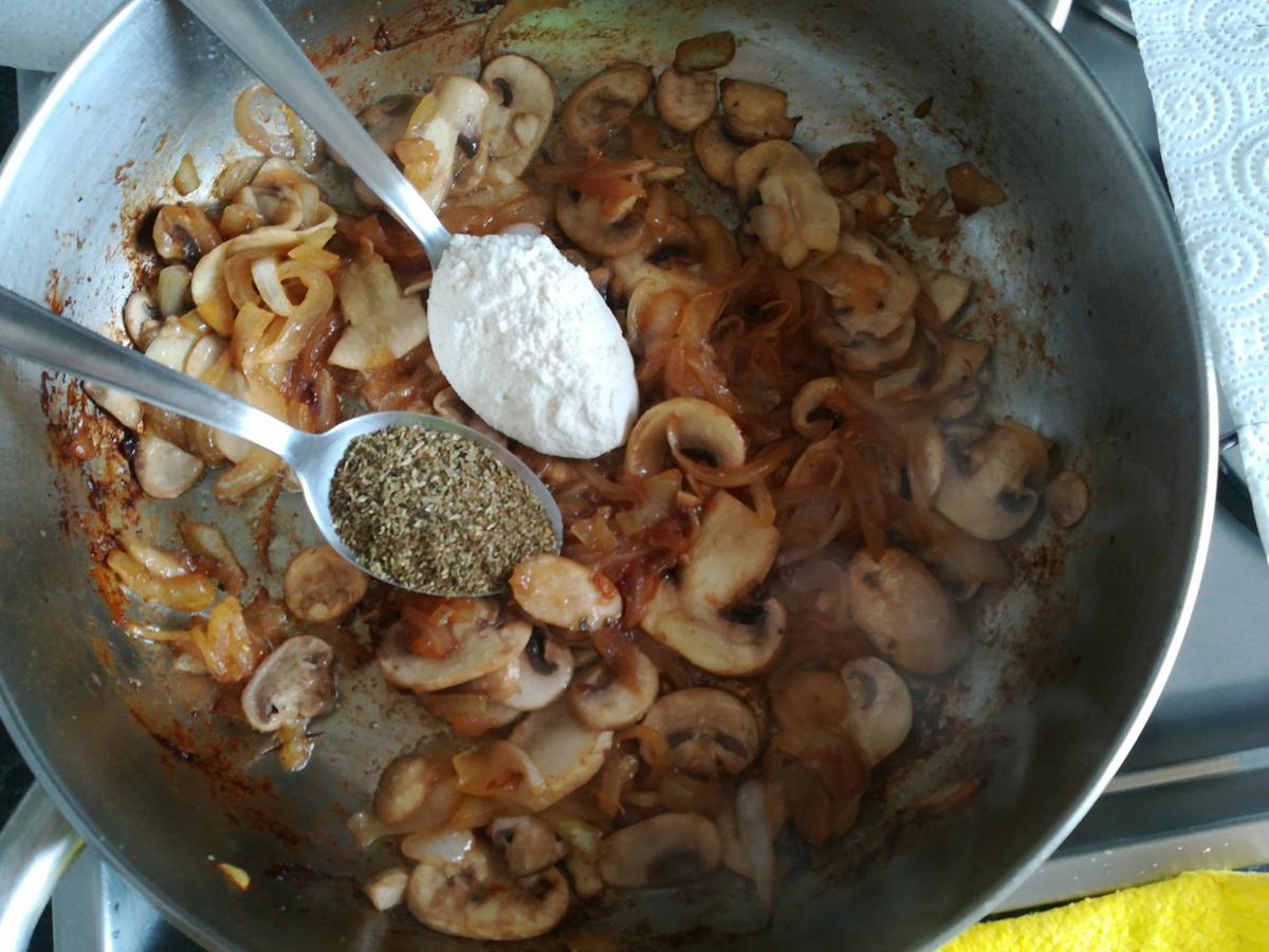Cuando esté dorada la cebolla incorporamos los champiñones, removemos, sofreímos a fuego medio. Añadimos la harina y el orégano.