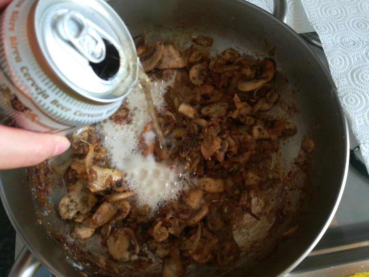 Mezclamos todo bien, que se rehogue la harina y vertemos la cerveza (que limpiará los restos del solomillo del fondo de la cazuela).