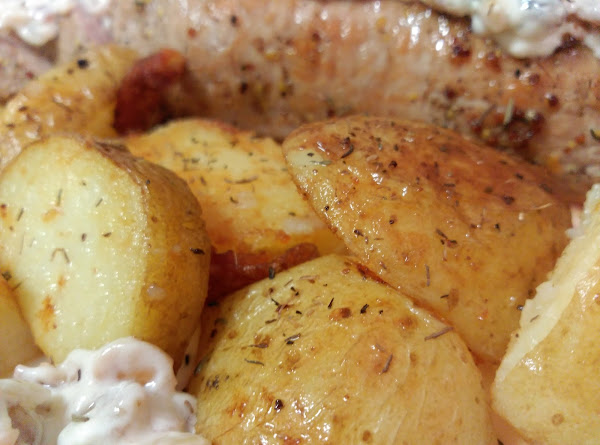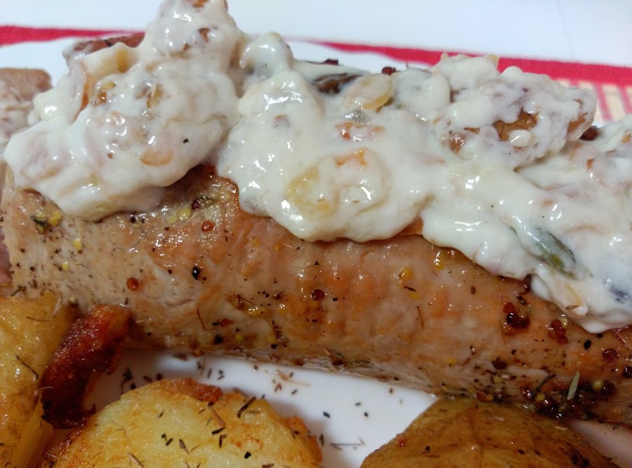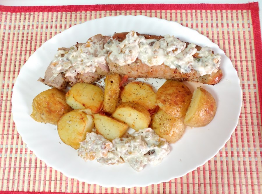 Yo como acompañamiento hice unas patatas, primero hervidas con su piel y después cortadas en trozos grandes y las pasé un poco por una sartén con un poco de aceite. Las aderecé con un poco de pimienta y tomillo.