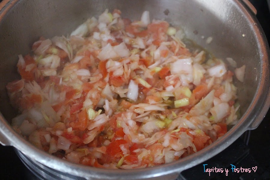 Picamos la cebolla, puerro, tomate y ajo. Yo lo hice con thermomix. Lo pochamos en el mismo aceite donde doramos la carne.