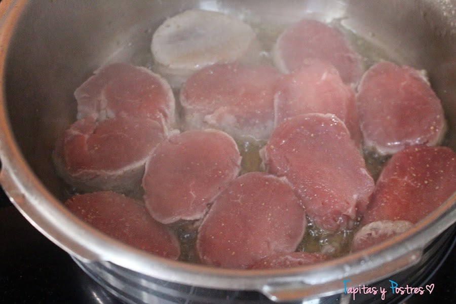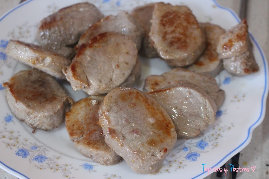 Comenzamos cortando el solomillo en medallones de un centímetro y medio de grosor. Los salpimentamos y marcamos en la olla con el aceite caliente. Hasta que se doren un poco.