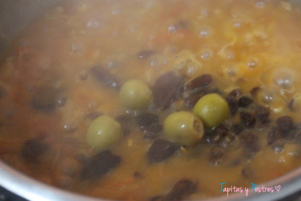 Cuando estén pochadas las verduras, añadimos el vino y dejamos que se evapore un poco el alcohol. Añadimos las especias, (comino, especias morunas, canela, sal y pimienta )la pastilla de caldo y los dátiles, pasas y aceitunas.