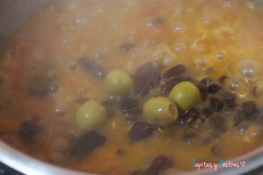 Cuando esté pochada la verdura, agregamos el vino blanco y dejamos que se evapore un poco el alcohol antes de agregar las especias, la pastilla de caldo, los dátiles, pasas y aceitunas.