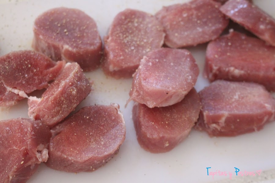 Salpimentamos la carne que habremos cortado en medallones gruesos.