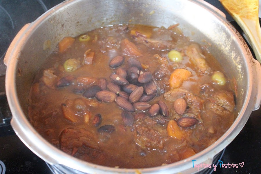 Cuando podamos abrir la olla, agregamos las almendras y pinchamos la carne y la zanahoria. Si están tiernos apartamos del fuego. Si no, dejamos unos minutos más con la tapa quitada. Podemos triturar la salsa, para eso, sacamos la carne , aunque os aseguro que no es necesario. Queda una salsa espesa, con tropezones pero exquisita.