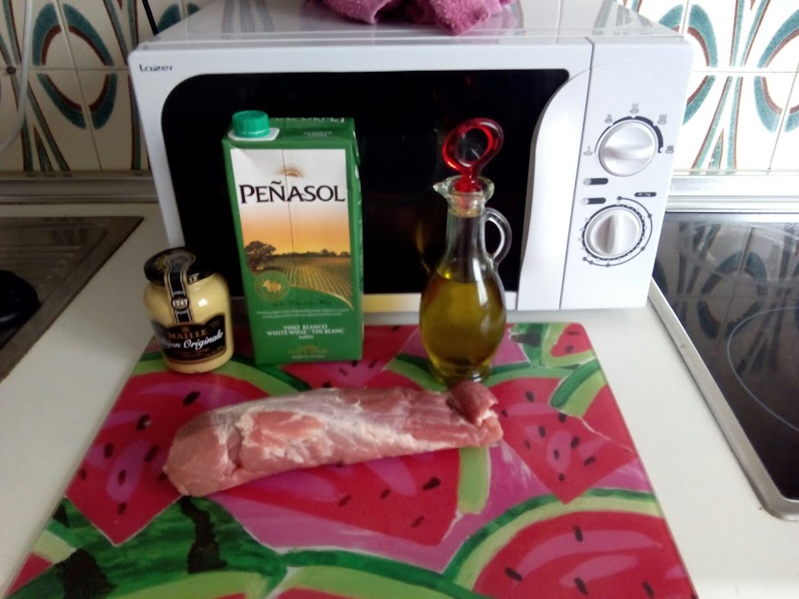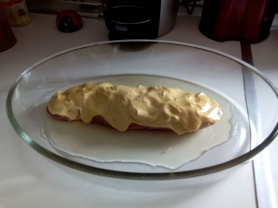 Lo primero que hacemos es colocar el solomillo de cerdo en una bandeja apta para horno y le echamos por encima una buena capa de mostaza, aunque eso dependerá de lo que os guste.