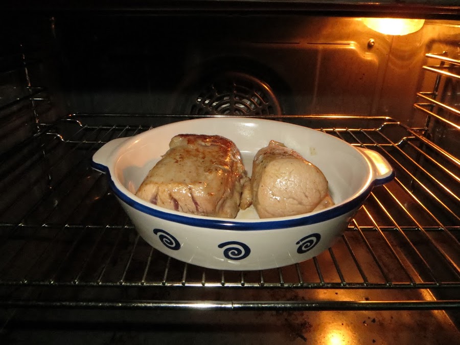 Una fuente apta para horno, ponemos la carne y la metemos al horno durante 15 minutos a 200º (tiene que estar precalentado). En la sartén donde hemos marcado la carne, echamos los granos de pimienta, les damos un par de vueltas y añadimos el chorro de vino. Esperamos a que el alcohol se evapore y añadimos la nata (crema de leche), damos unas cuantas vueltas hasta encontrar el espesor óptimo de la salsa.