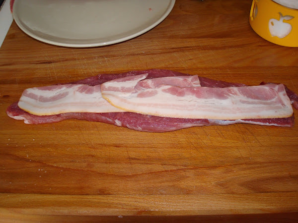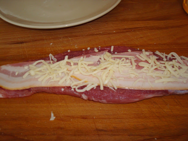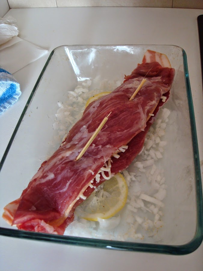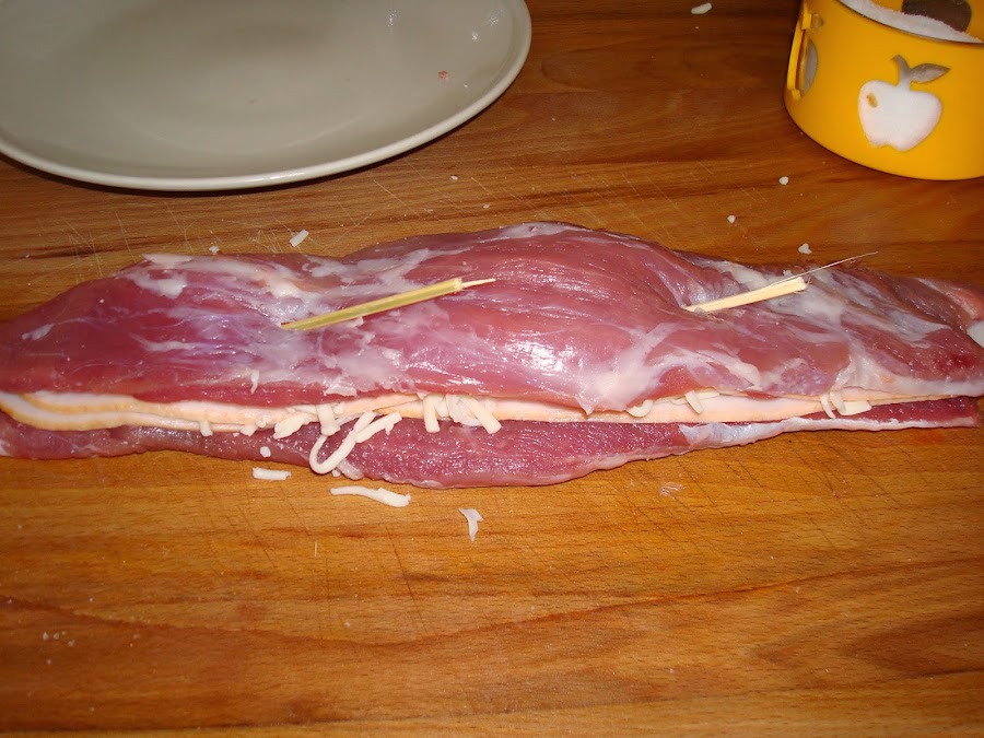 Salpimentamos el solomillo al gusto y colocamos 2 lonchas de beicon, un poco de queso y otras 2 lonchas de beicon. Yo lo he sujetado con 2 pinchos de madera.
