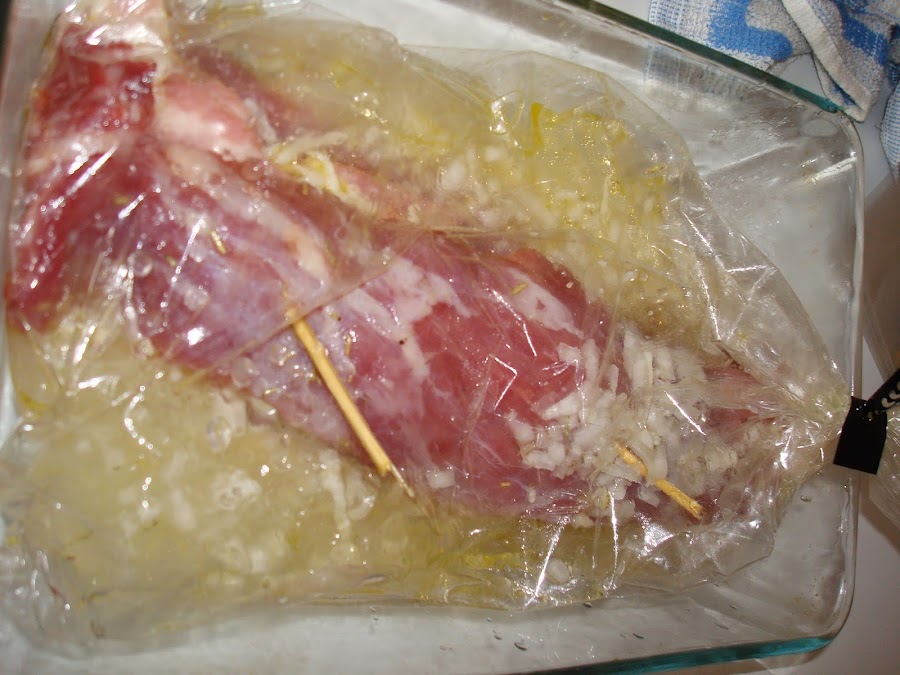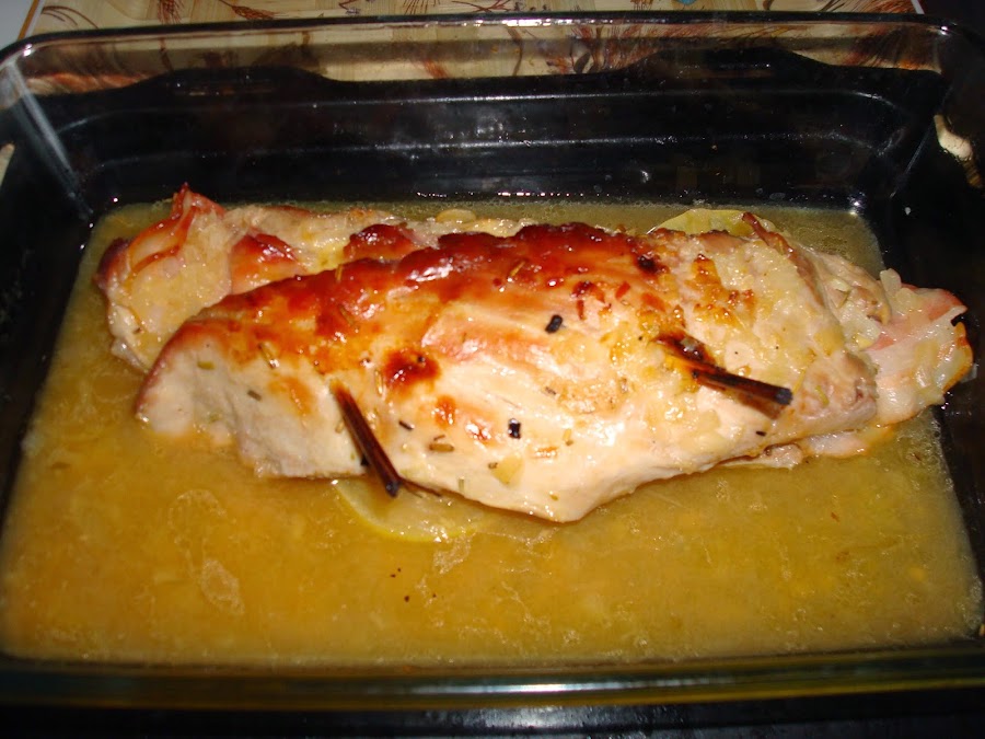 A continuación ponemos en la bandeja donde teníamos el cebollino y el limón y echamos el vino y un poco de romero.
