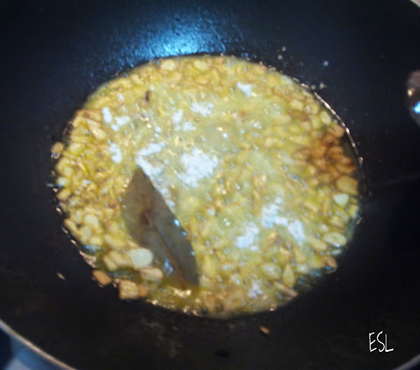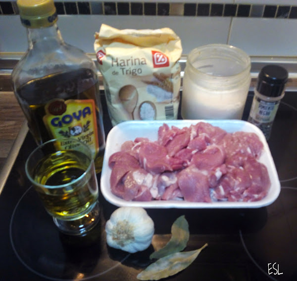 Pela el resto de los ajos y pícalos. Una vez sellada toda la carne, añade a la cazuela 1 o 2 cucharadas más de aceite para sofreír los ajos picados junto con las hojas de laurel. Cuando comiencen a dorarse, añade la cucharada de harina, remueve un minuto hasta que se tueste ligeramente y vierte el vino. Remueve hasta que se evapore el alcohol y añade 1 vaso de agua.