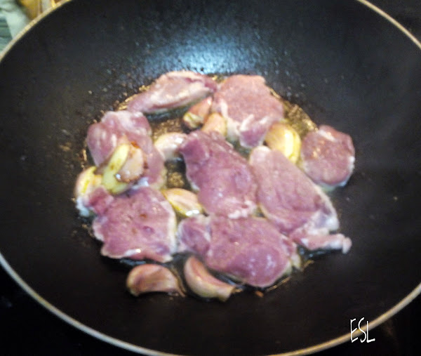 Coloca al fuego una sartén o cazuela con 2 cucharadas de aceite y 4 o 5 dientes de ajo con piel y un golpe dado. Sella la carne, previamente salpimentada, en varias tandas hasta que esté dorada y reserva en una bandeja junto con los ajos fritos.