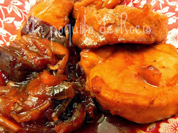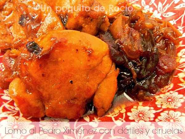 En ese mismo aceite y añadiendo un poco más, echamos una cebolla grande cortada en juliana a rehogar, se dorará en un par de minutos, entonces le ponemos 3 cucharadas soperas de azúcar moreno, ligamos bien y cuando se disuelva le vertemos un vaso {200 ml} de vino dulce Pedro Ximenez. Entonces troceamos 10 ciruelas pasas sin hueso y 5 dátiles y lo añadimos a la sartén, le damos unas vuelta y agregamos por último un vaso de caldo de pollo. Agregamos la carne que habíamos reservado, bajamos el fuego {en mi vitro al 6 de 9} y dejamos que reduzca durante 10 minutos, hasta que la salsa espese a la mitad.