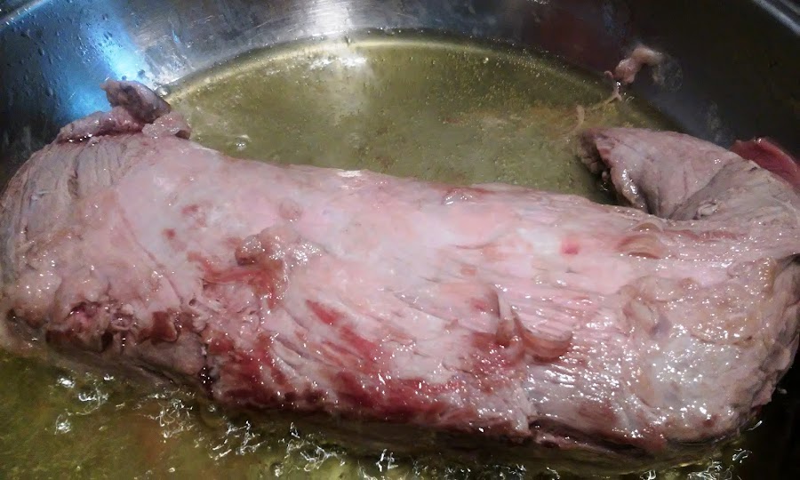 Doramos el solomillo por todos lados a fuego lento en una cacerola con aceite caliente en el fondo. Saca y reserva.
