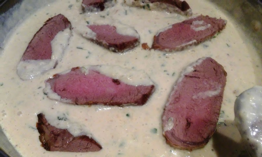 Tritura la salsa, ponla de nuevo en la cacerola con el solomillo cortado en rodajas la salsa y deja que cueza en ella un minuto más, lo justo para que la carne coja un poco de sabor de la salsa y no quede reseca.
